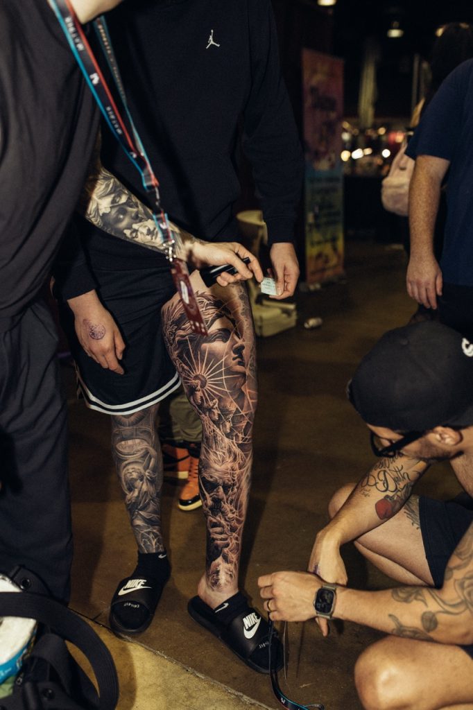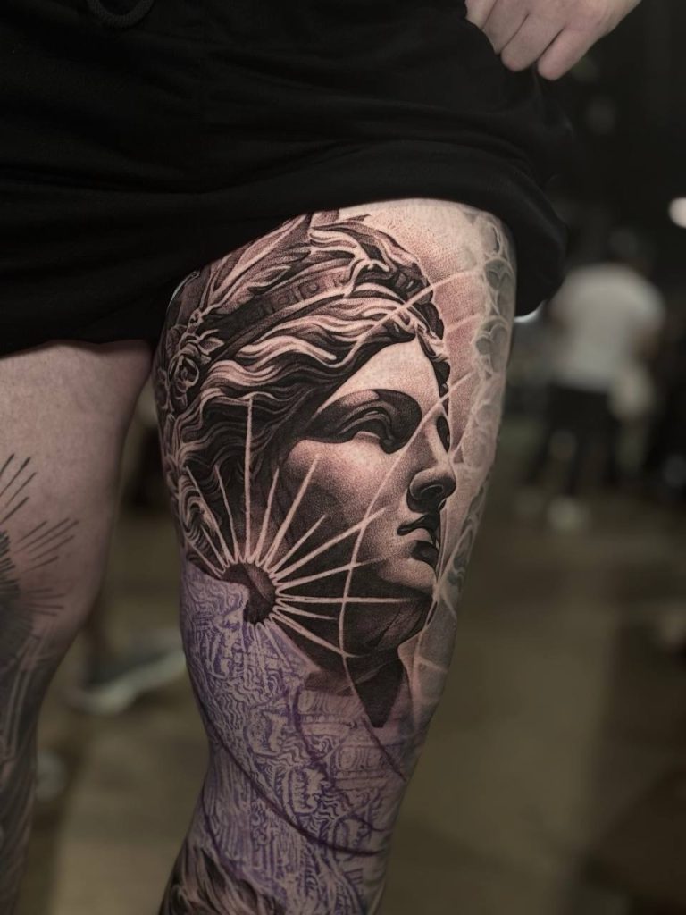 My favorite projects often happen at conventions because clients tend to give me full creative freedom. One memorable piece was a full inner leg tattoo of Athena’s face surrounded by radiant beams, which flowed into dynamic sculptural figures. It was the result of months of ideas poured into a single design that captured a marble-like texture, lifelike volume, and a deep sense of story.