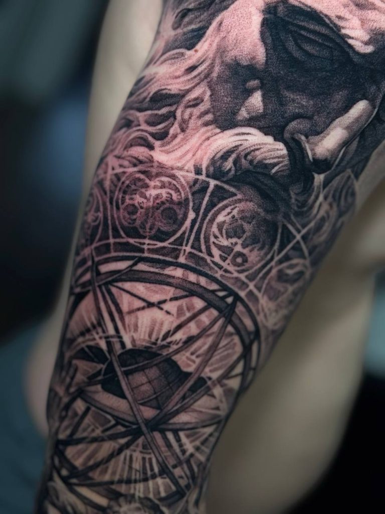 I would describe my style as black and grey realism with a sculptural, almost three-dimensional feel. My work aims to look like carved stone or a living statue on the skin. Greek mythology is my main source of inspiration, but I also draw heavily from classical sculpture, Renaissance art, and chiaroscuro painting techniques. They all bring a sense of elegance, symbolism, and depth to my designs.